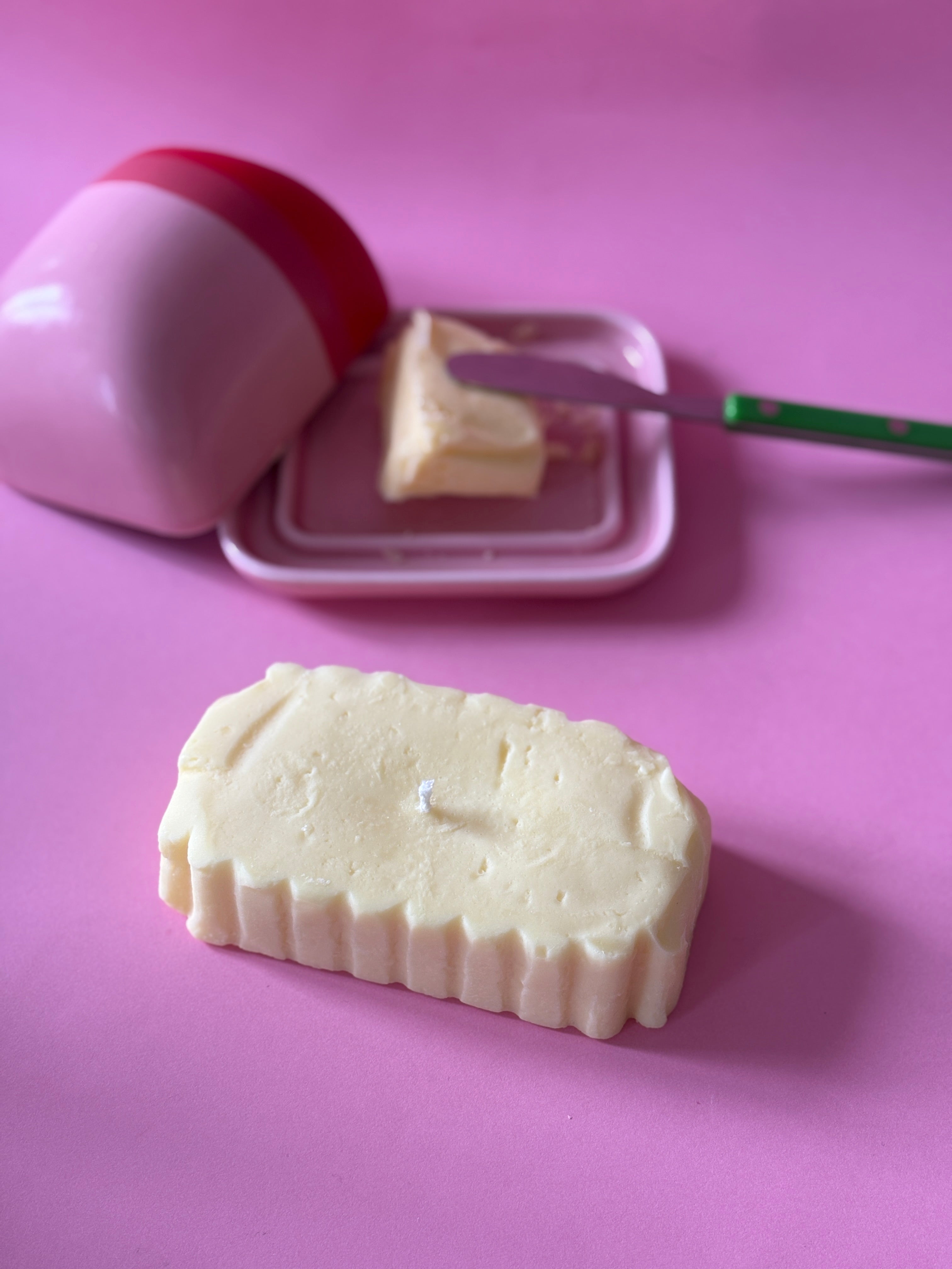 Voici l’illusion parfaite : une bougie qui ressemble à s’y méprendre à une motte de beurre aux cristaux de sel. Faite à la main avec une cire de colza de qualité. Un clin d’œil audacieux à nos tables françaises, parfait pour ajouter une touche d’humour (et de style) à votre intérieur.